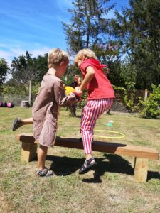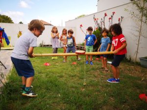 Enfant qui jouent au jeu des bambous, lors d'un gouter d'anniversaire de Koh Lanta Kids